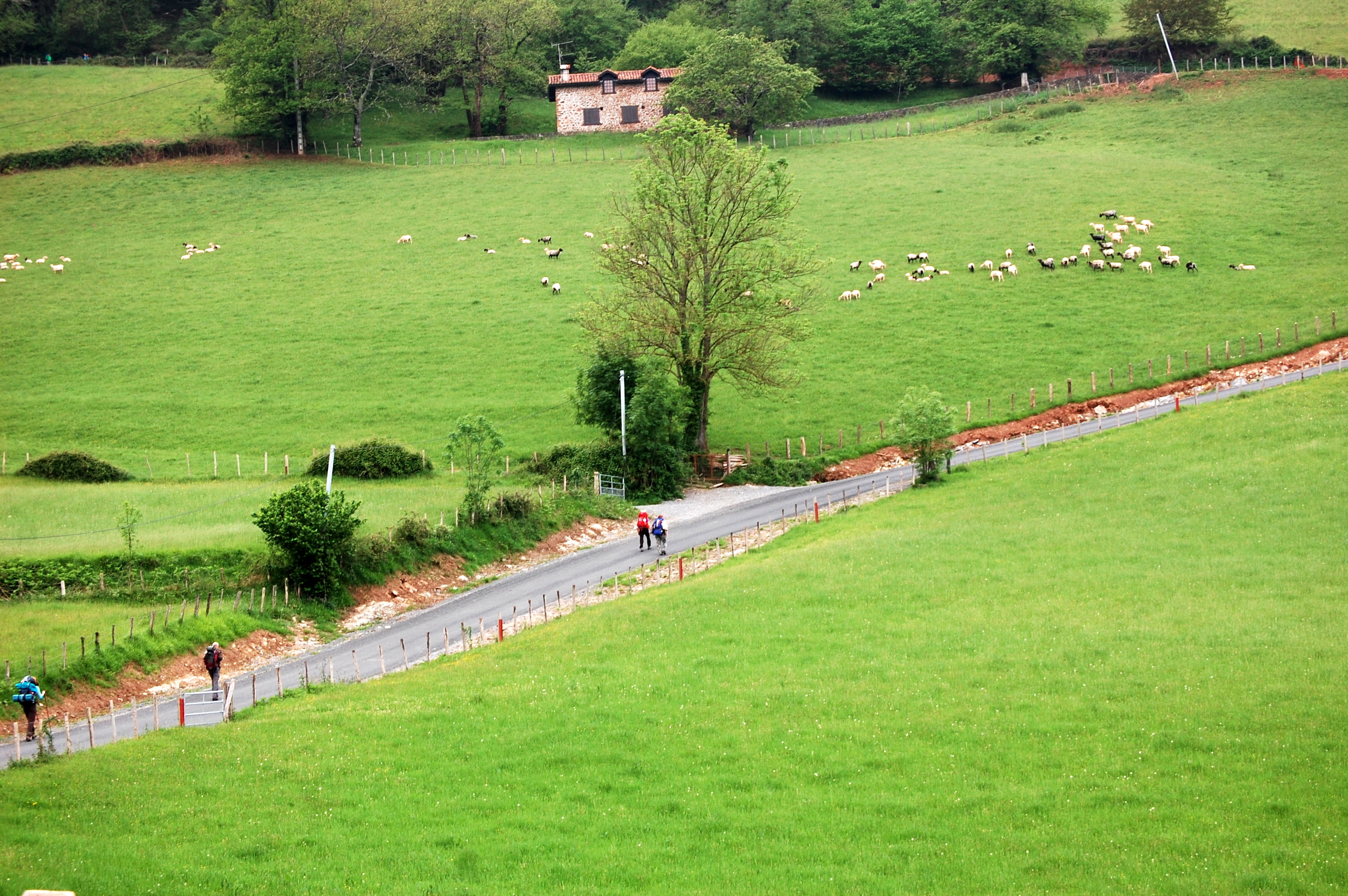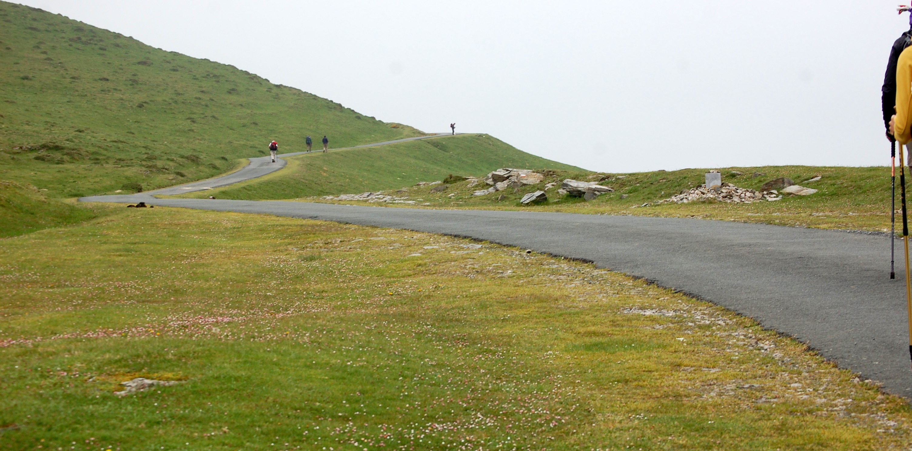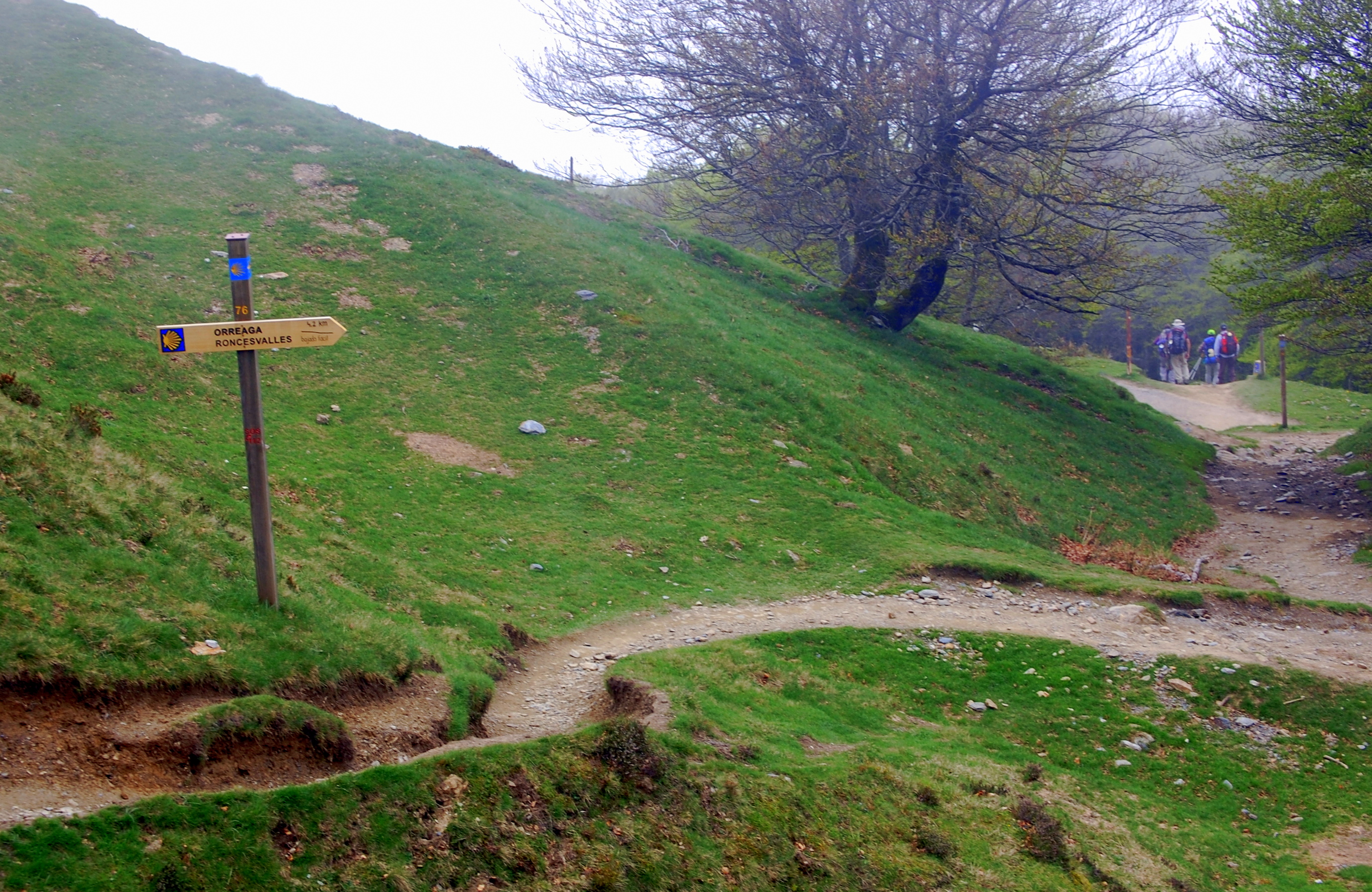 Antes de llegar al punto de descenso, hay una opción muy recomendable a seguir. Si ha llovido o está el tiempo como para llover, mejor desviarse a la derecha y seguir las indicaciones del GR-12 para descender menos vertiginosamente y por carretera secundaria mayoritariamente. Este camino opcional nos acerca a la Iglesia de Ibañeta, y más adelante, en 500 m. estaremos en Roncesvalles. Por la vertiente que nos marca como «camino», corremos el riesgo de caer o hacernos una torcedura porque el firme es muy rocoso e inestable. La cuestión es que por el camino habitual son 6 km y por el GR-12 son 10km.