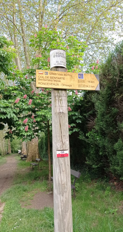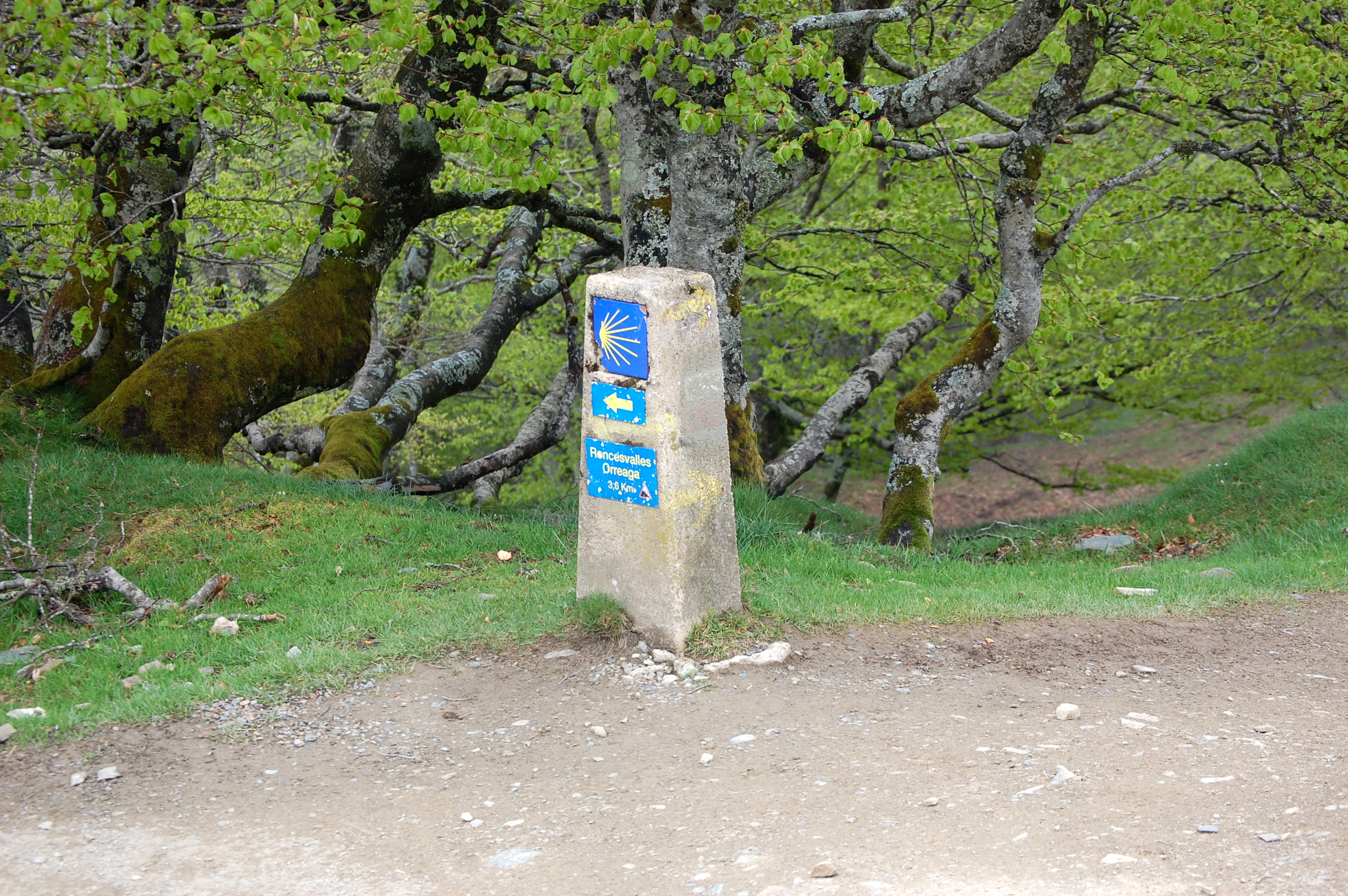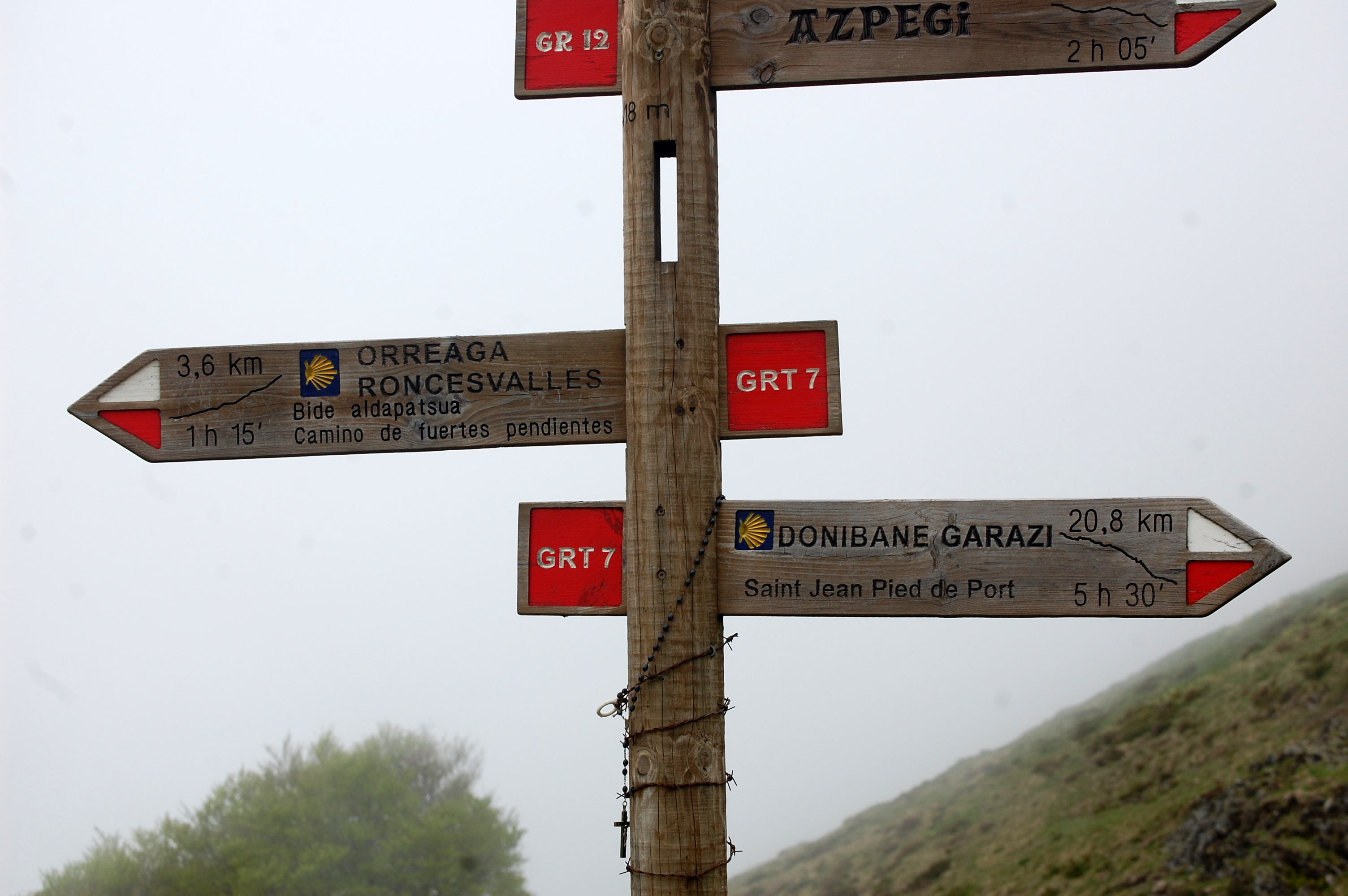 Saliendo por la «Puerta de España» en la Ciudad seguiremos las indicaciones y a otros peregrinos, para empezar la subida a los «Puertos de Cize», que durante 20 km subiendo en zig zag pronunciado y a veces menos exigente, llegaremos al famoso panel, para seguir por sendero abierto fijándonos con atención, siempre, de las señales. Dos puntos emblemáticos en esta etapa son: La Virgen de Biakorri, protectora de los pastores y la Cruz de Thibault.