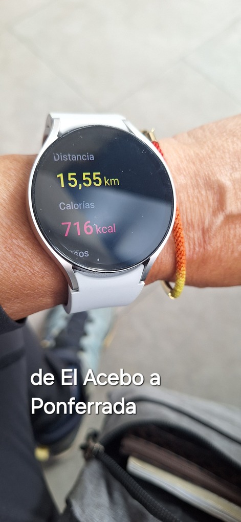 La foto del reloj de pulsera Samsung que llevaba indica menos kilometraje del que en realidad hay, porque me desvíe del camino para andar por la carretera y la entrada a Ponferrada la hice por la acera junto a esta misma carretera. Recorte, en definitiva, un 1,500 km.