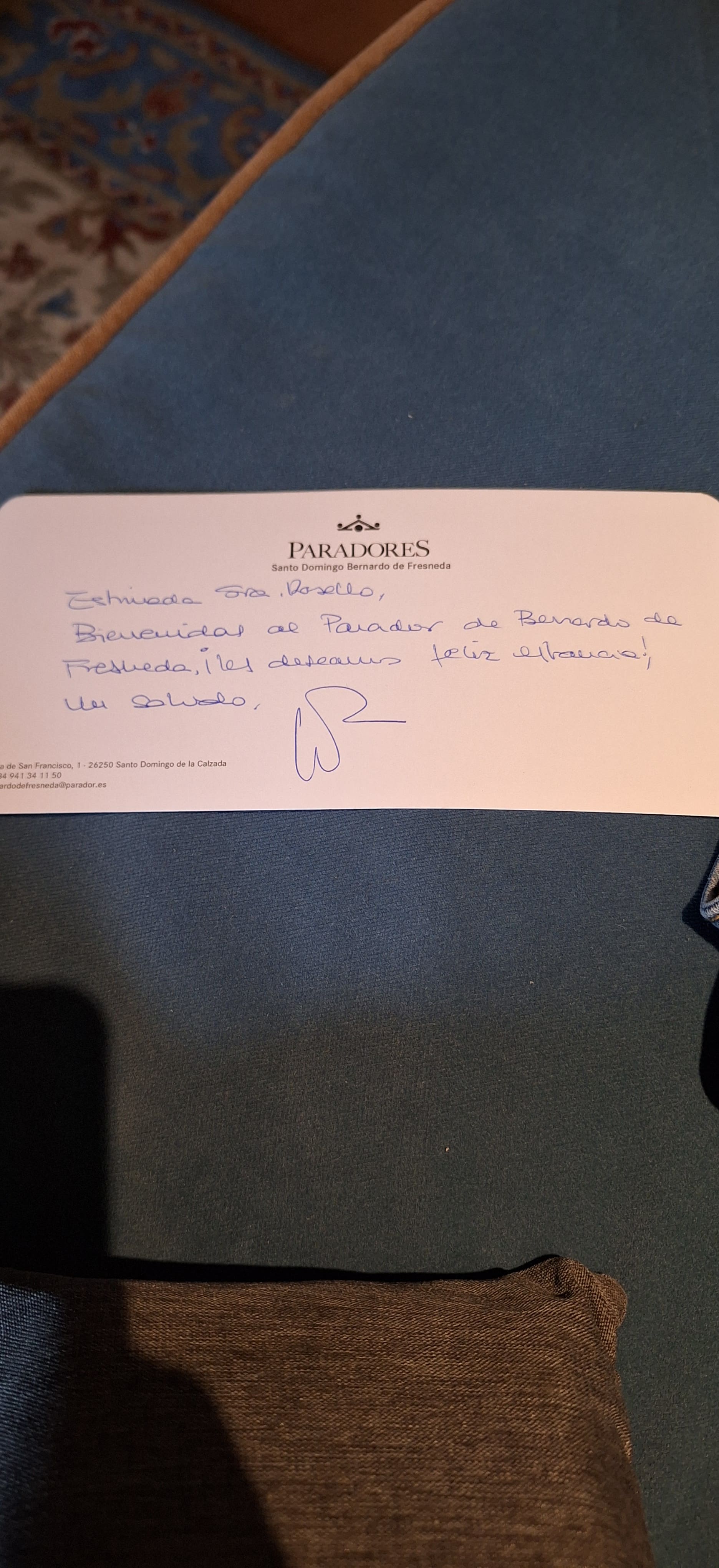 Tengo que reconocer que llegar a Parador de Bernardo Fresneda en Santo Domingo de la Calzada nunca me había hecho tanta ilusión como este año. El personal, una vez más, de los más agradable y atento, que además me dejaron un detalle de cortesía en la habitación. Llegué después de comer en el otro Parador, el de Santo Domingo de la Calzada porque en el mío no hay servicio de Restaurante, únicamente para desayunos.