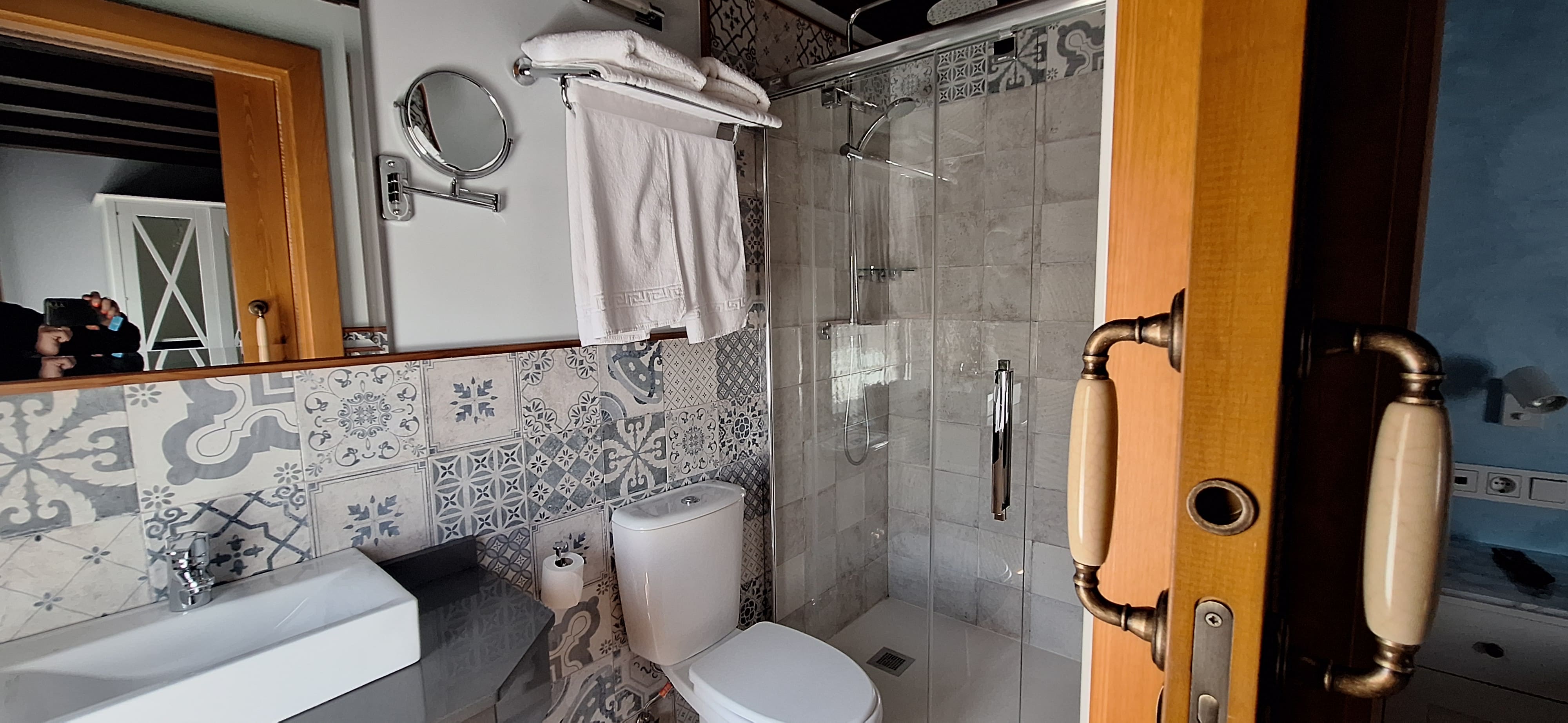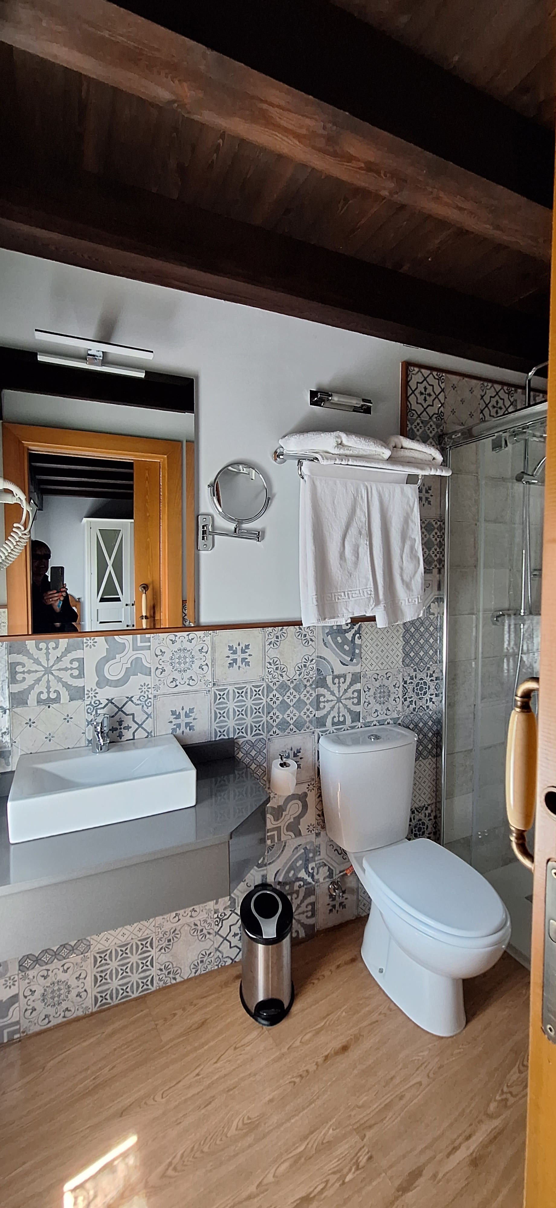 Estaba explicándoles que el personal de Hotel O Cebreiro no es que sea de lo más cariñoso del mundo, son muy secos y poco expresivos. Nunca sabes si te contestarán o simplemente ni te escuchan. Caras serias y pocas sonrisas. La cuestión es que les explicaba esto a mis amigos mexicanos, además de que la habitación que tengo en este Hotel es siempre la misma desde que Blanca y Miguel me presentaron al dueño de este negocio. Siempre hago la reserva directamente a este amigo de ellos que se encarga de registrar mi reserva personalmente. Pues la encantadora mujer de recepción aparece en el comedor, con una sonrisa (sabe sonreír) y me pregunta si podría cambiarme de habitación porque tiene un grupo en el Hotel y les falta 1 habitación para el grupo y como han hecho reformas en CASA VALIÑA y lo han dejado impecablemente reformado, me ofrecía una de las mejores habitaciones de la casa reformada. A todo esto, el camarero, otro personaje que sirvió a todo el comedor antes que a nosotros 3 y parecía que nuestra presencia era invisible, pasando de traer la bebida o el pan, pero la cuestión es que ambos estaban de pie delante mío proponiéndome este cambio. Y no me pude negar, por educación o por temor a seguir siendo una desconocida que se aloja en el mismo hotel y la misma habitación cada año, y acepté el cambio. Bueno, lo siguiente fue alucinante: me dio un abrazo la mujer al darme la llave de mi habitación en Casa VALIÑA.