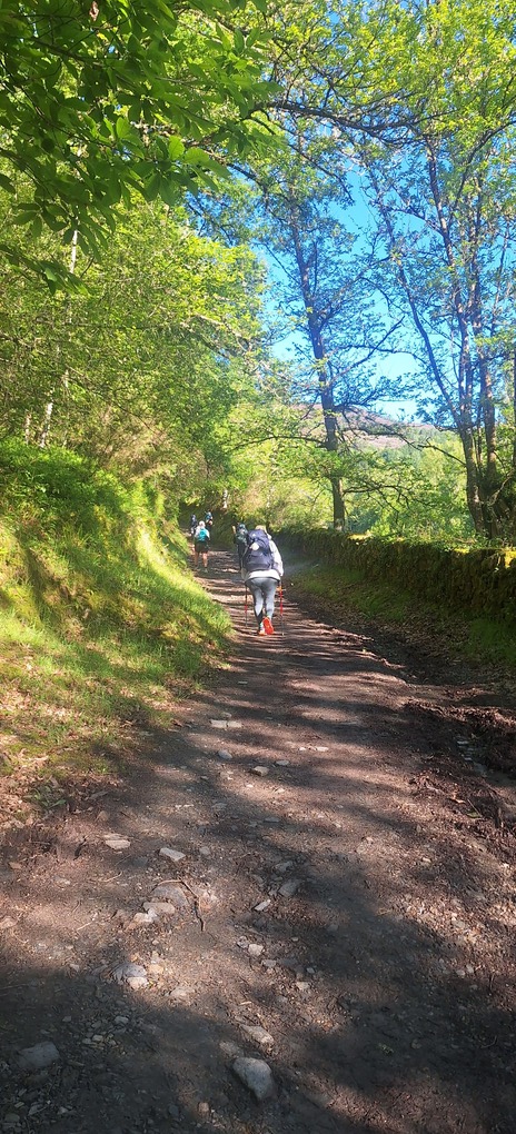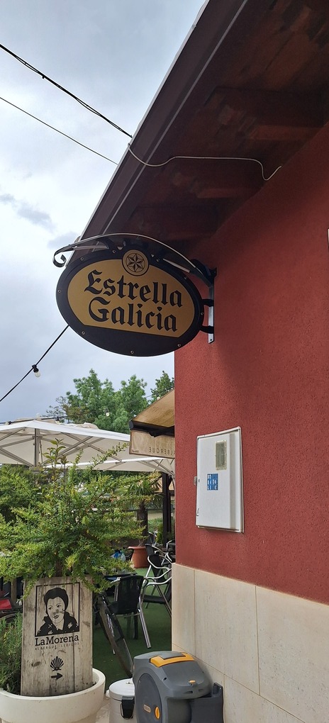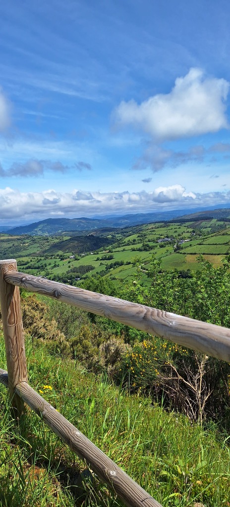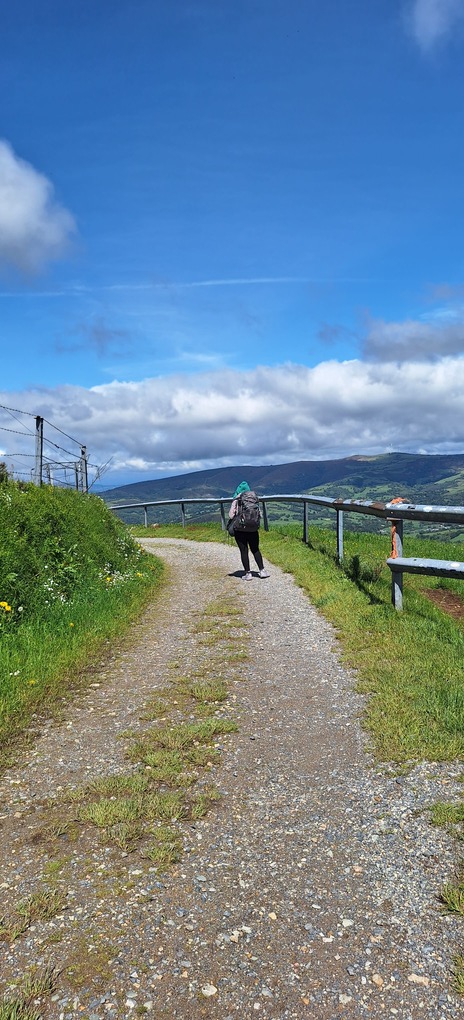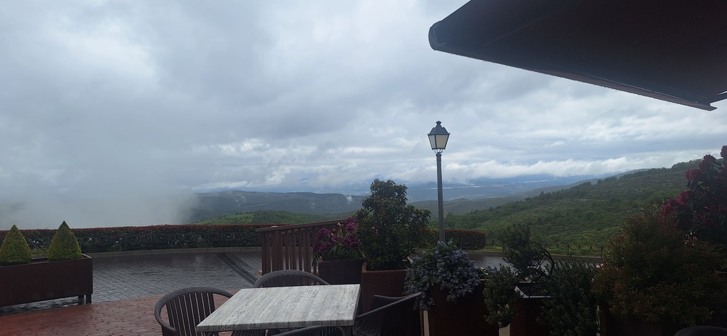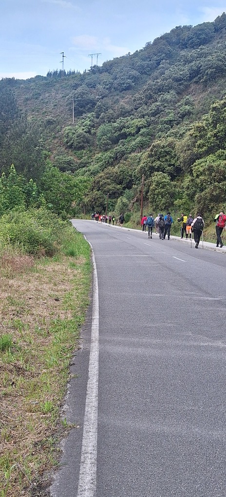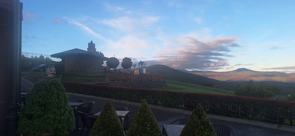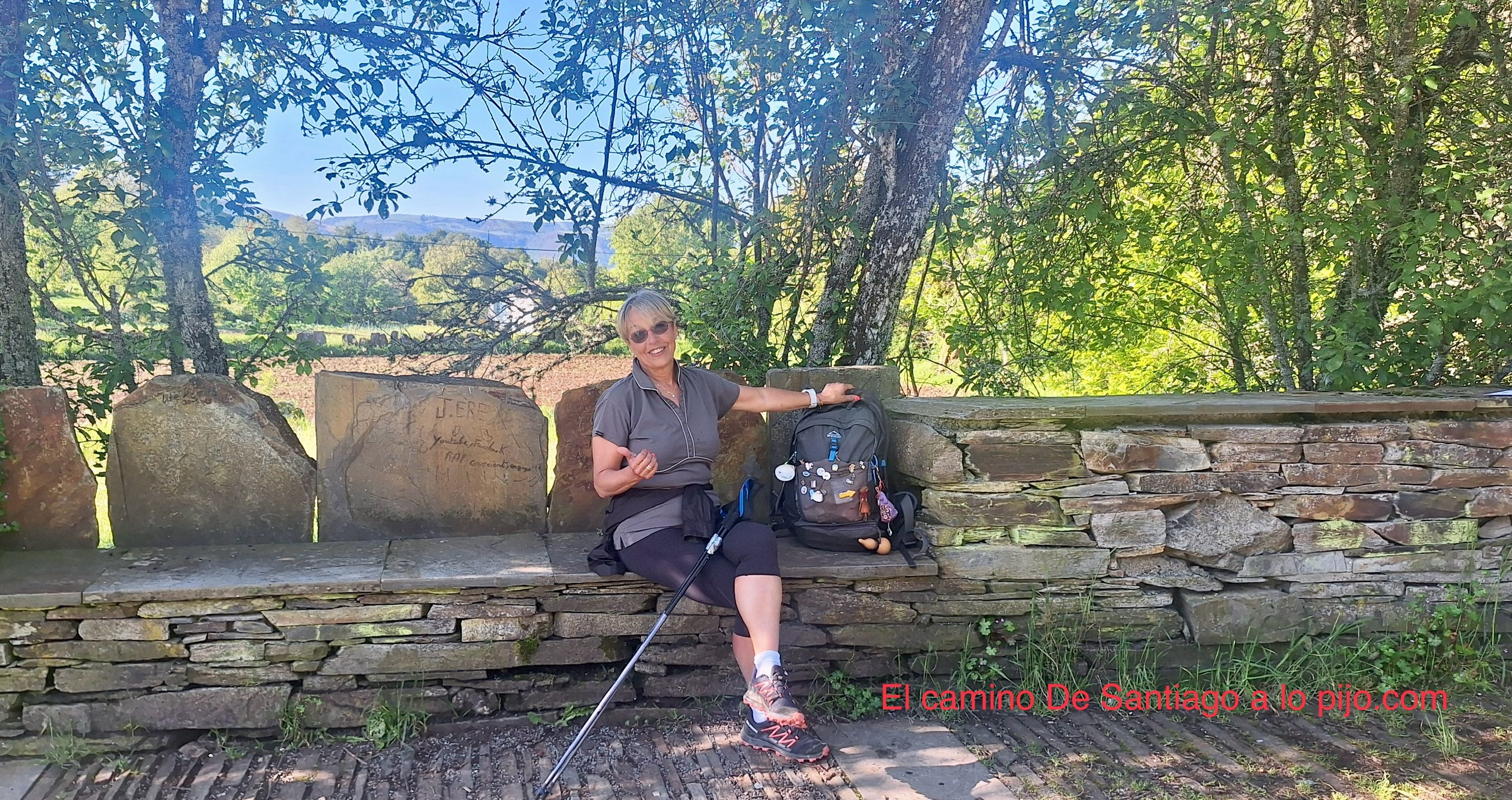 Disfruté de la compañía, a ratos, de Esther mientras comía en la terraza de su Restaurante, donde también charlé con un grupo de jóvenes que se habían sentado a esperar a otros que iban llegando a medida que acababan la etapa. Pude intervenir en la conversación porque de estos jóvenes porque le había dado mi gel frío para los pies a uno de ellos que decía estar pasándolo fatal con las ampollas. Ya los había visto a casi todos en Alto del Poio, sentados después de llegar a este punto del camino, un ascenso en zig zag que nos agobia bastante pero que es espectacular si miras el paisaje que dejas atrás.