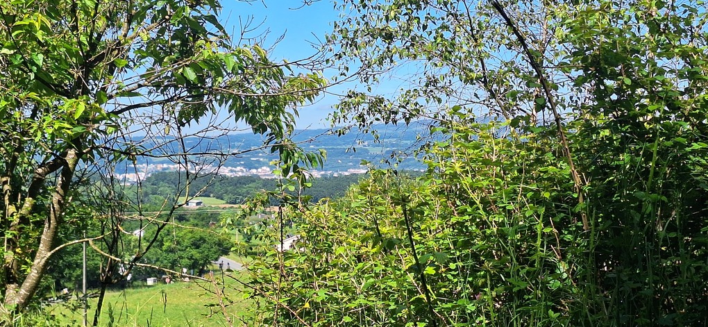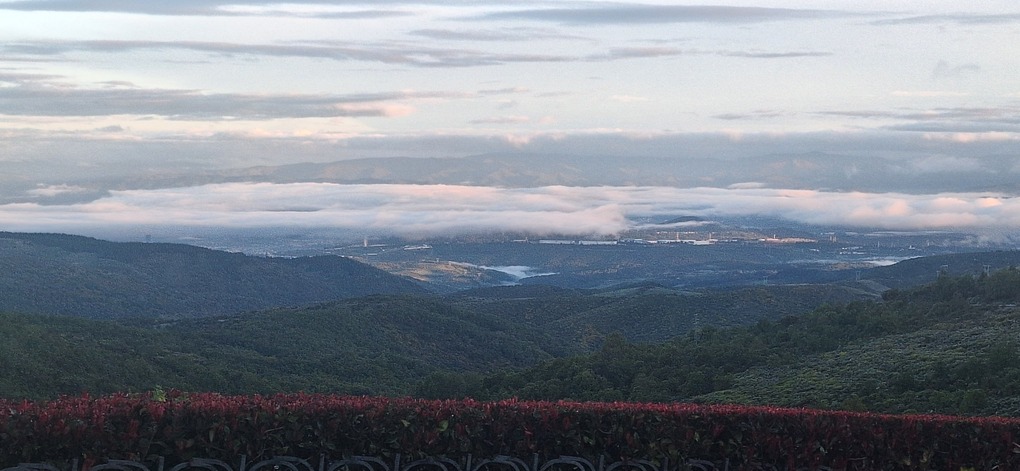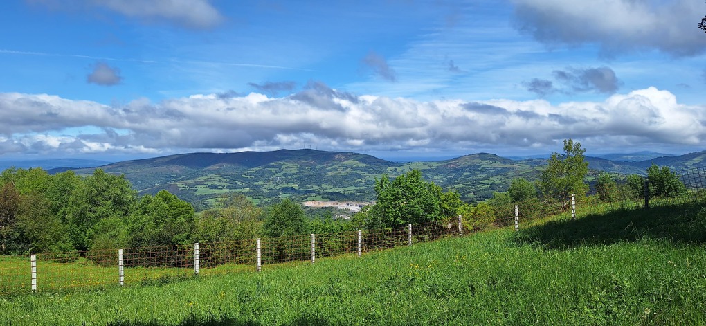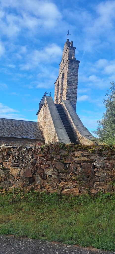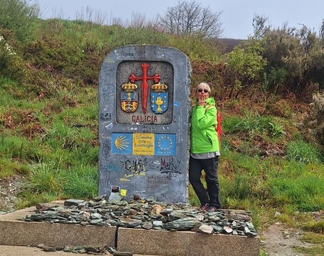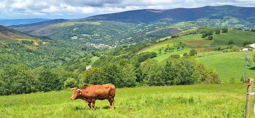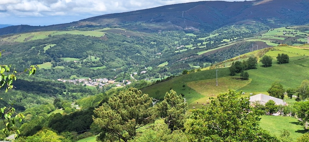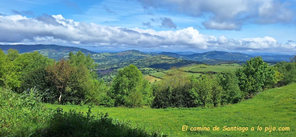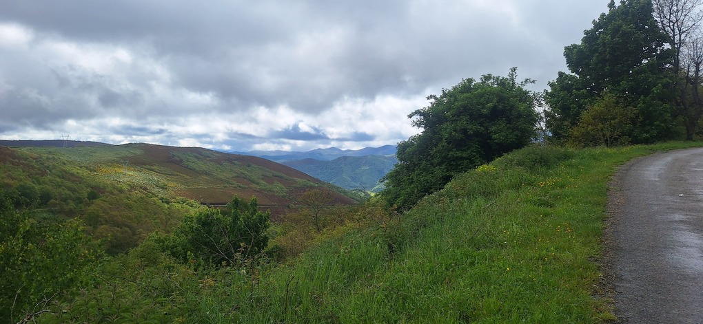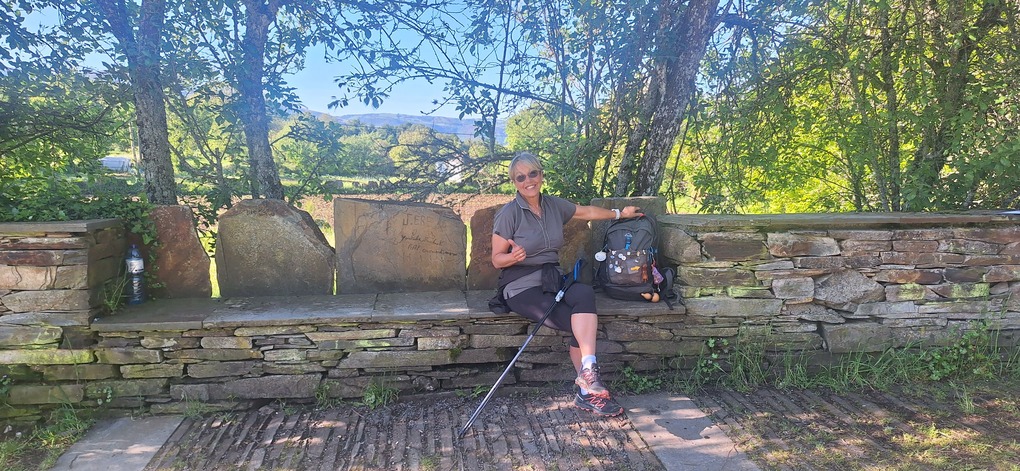 Disfruté de la compañía, a ratos, de Esther mientras comía en la terraza de su Restaurante, donde también charlé con un grupo de jóvenes que se habían sentado a esperar a otros que iban llegando a medida que acababan la etapa. Pude intervenir en la conversación porque de estos jóvenes porque le había dado mi gel frío para los pies a uno de ellos que decía estar pasándolo fatal con las ampollas. Ya los había visto a casi todos en Alto del Poio, sentados después de llegar a este punto del camino, un ascenso en zig zag que nos agobia bastante pero que es espectacular si miras el paisaje que dejas atrás.