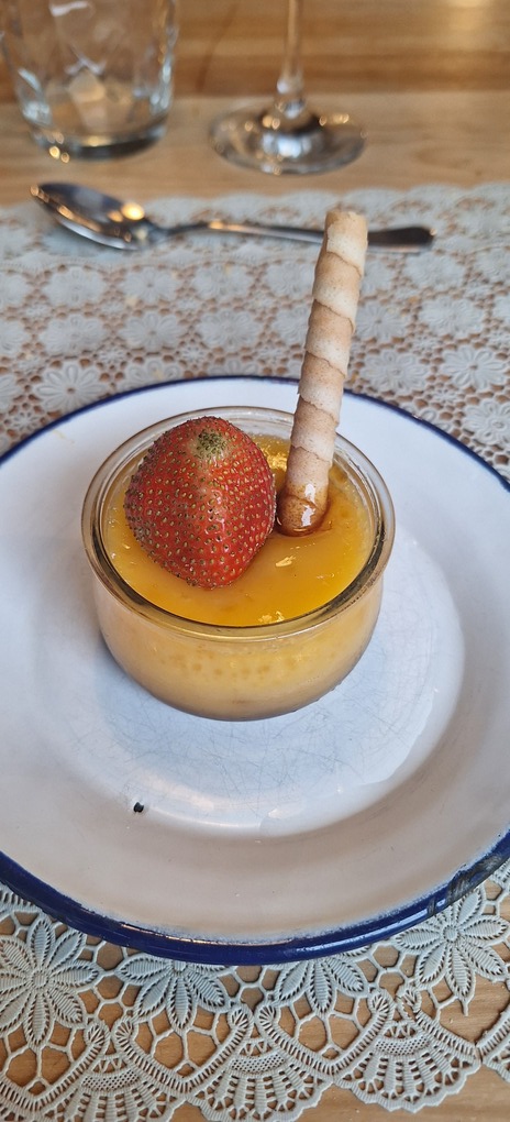 Me sorprendió satisfactoriamente el recibimiento en ALBERGUE LA MORENA, además de ser un Restaurante muy curioso donde comí muy bien y los más increíble fue el postre¡¡ Algo que no pido nunca porque considero que engorda más que cualquier otra cosa. Pero ahí os dejo inmortalizado este casero «tocinito de cielo» con fresa y caramelo. Rico Rico, como diría Arguiñano.