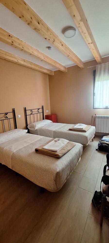 Curioso y limpio, acogedor y tranquilo, a pesar de anunciarse como ALBERGUE, dispuse de habitación individual espaciosa y bien aireada, tenía ventana en el baño y en la habitación. Además el trato del personal extraordinario. Muy bien organizados con el caos de la llegada de peregrinos totalmente mojados de la lluvia que caía, con ganas de sacarse la ropa y entrar en calor, pero todos a la vez y muchos. Aún así nos atendieron rápidamente, agrupándonos para llevarnos a las zonas donde nos correspondía a cada uno. Me encantó todo¡¡ y más aún el precio¡¡