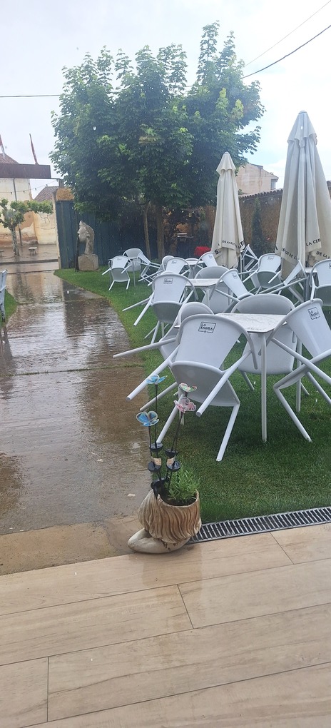 En ALBERGUE LA PERALA, de Bercianos del Real Camino, tenía reserva con desayuno incluido, de una habitación individual con baño privado. Aunque el día amaneció claro, por la tarde, justo cuando acababa de la lavar la ropa sucia, acumulada en la maleta, empezó a llover a mares y tuve que tender las cosas en mi habitación, entre sillas y el baño. La cuestión es que al día siguiente, debido a la tormenta que anunciaban que iba a caer, pedí un taxi, junto con otros dos peregrinos lesionados que no podían seguir su camino.