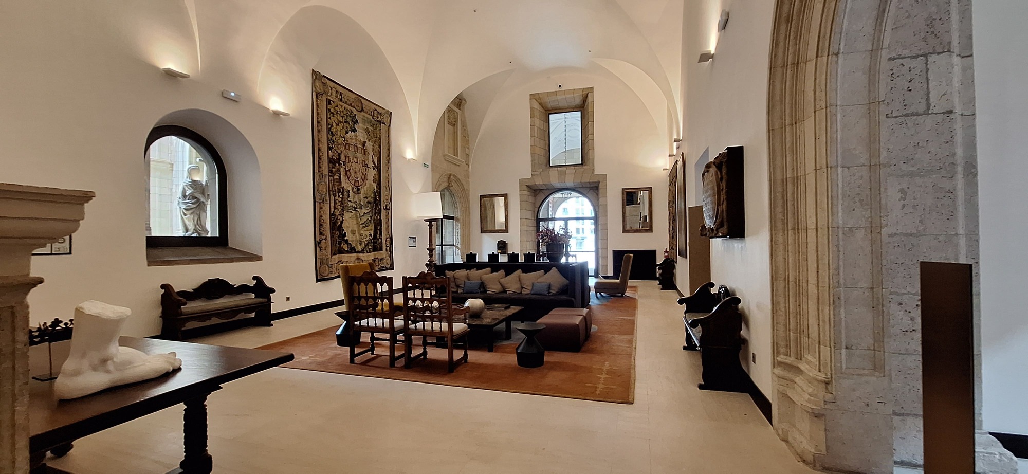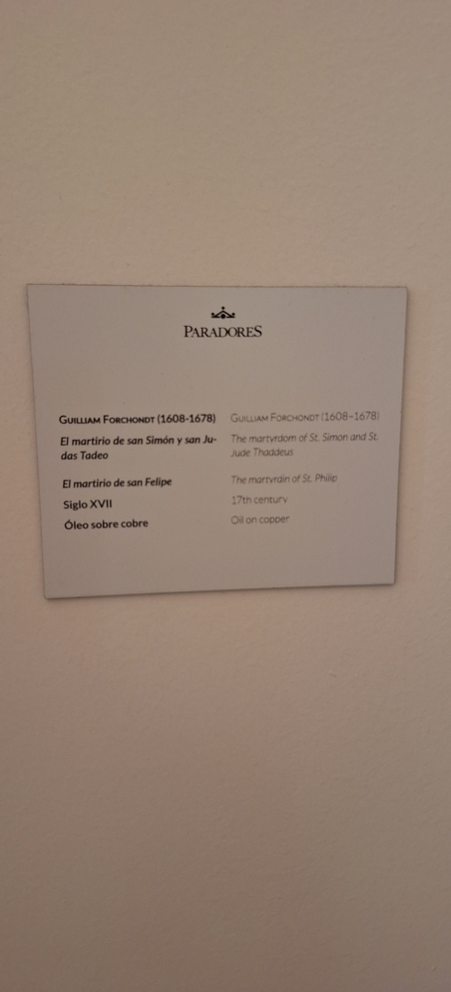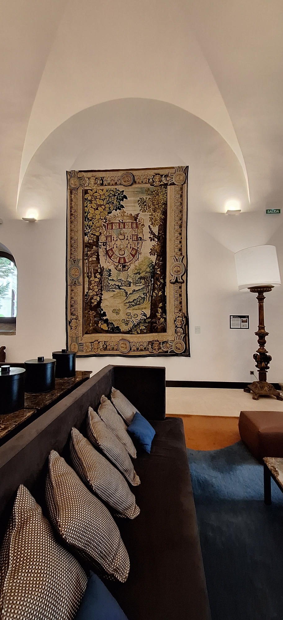 Y de nuevo, tarde de habitación y paseo por el Parador que tiene su historia propia, muy interesante, habiendo sido un lujoso albergue de Peregrinos en el S.XVI. Se halla en el interior del Convento de San Francisco, un hermoso Monasterio. Es un edifico de contrastes, con sus habitaciones con paredes de piedras, de colores rojo caldero y grises azulados, además tiene una colección artística clásica y la vez vanguardista, magníficos salones y lo que más aprecio en realidad, es que me dan la misma habitación con vistas a la salida del día siguiente, así que veo pasar a los más madrugadores cuando despierto, desde mi ventana de las banderas. En esta ocasión me dieron una habitación más amplia y tranquila. Me siento privilegiada en este lugar con tanto encanto¡¡¡
