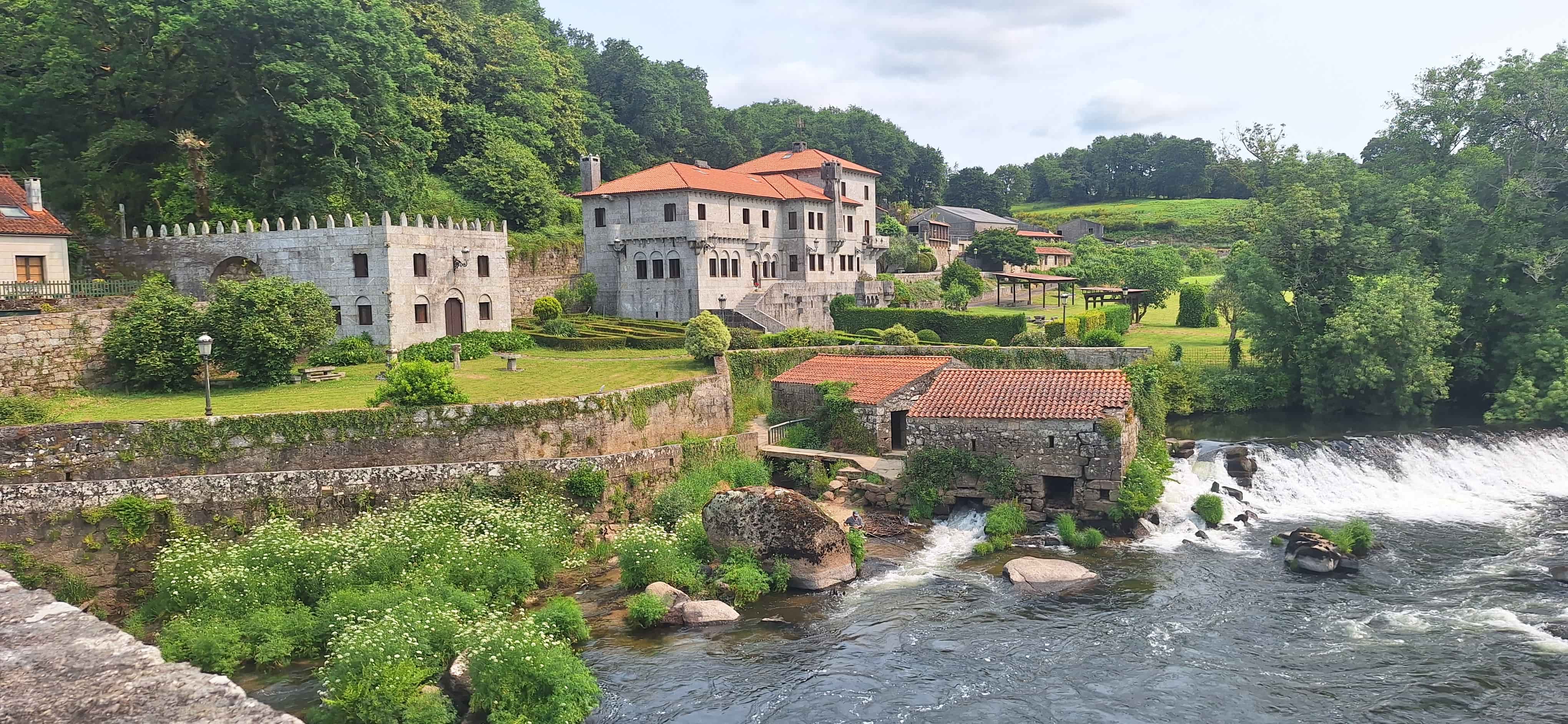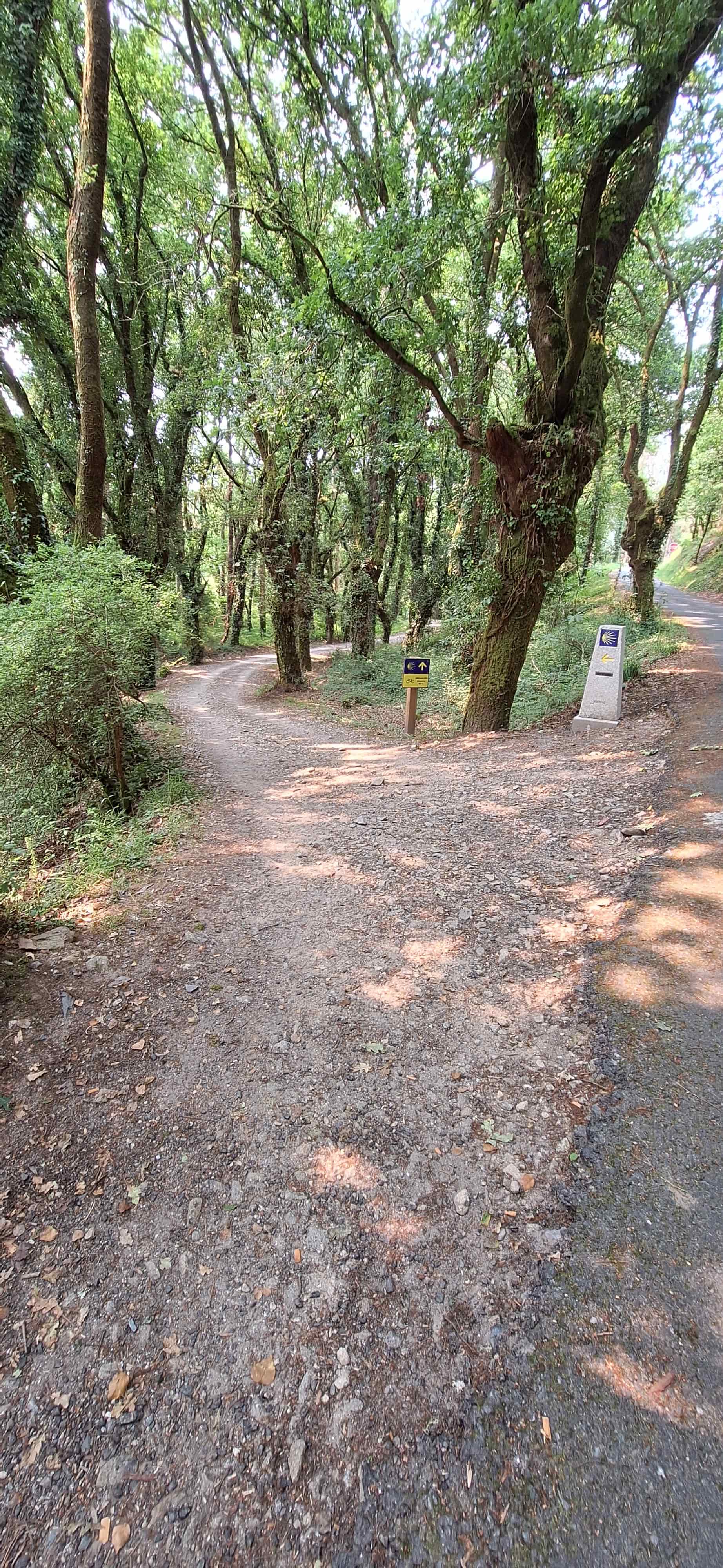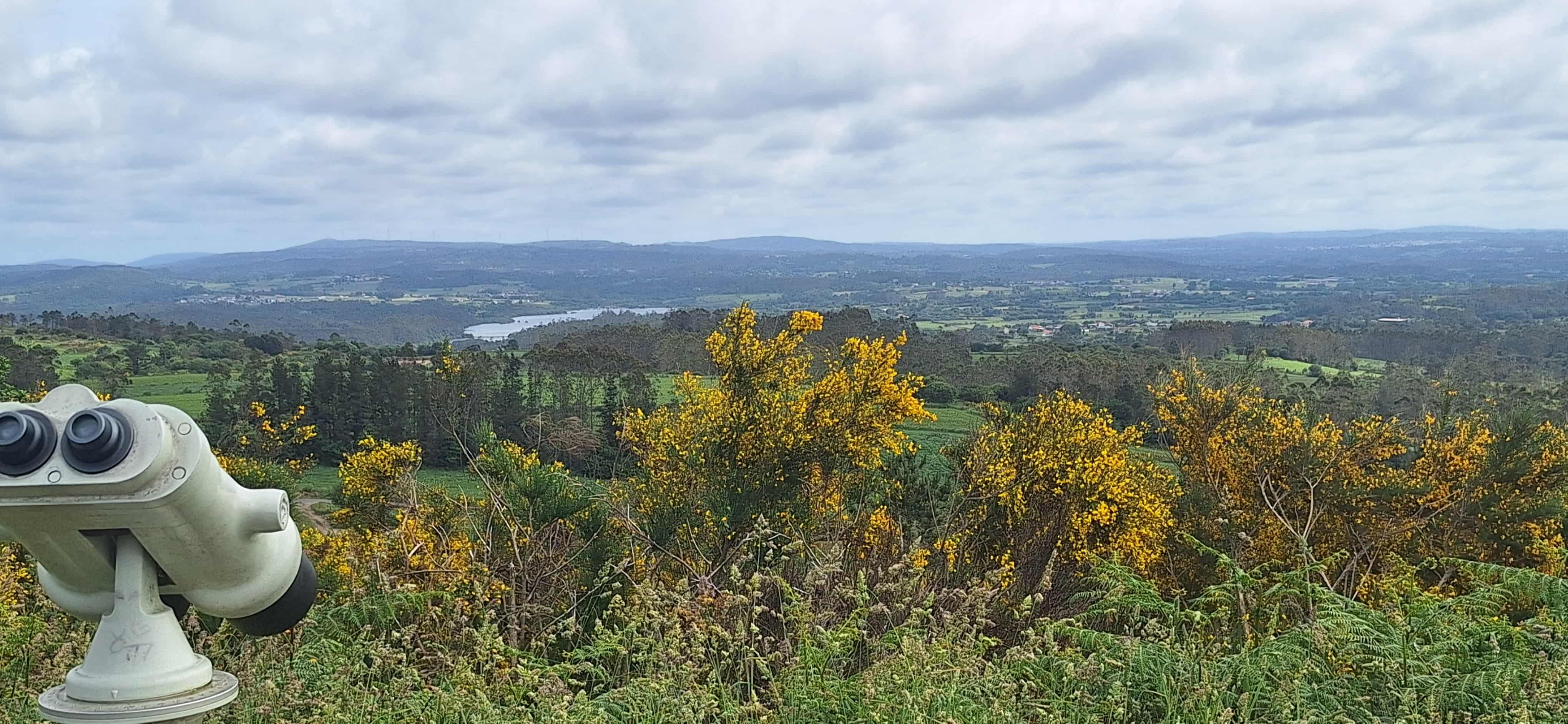 Esta etapa tiene mucho asfalto y caminos amplios, poca vegetación y pocos bosques. Pero no es de grandes subidas a excepción de un tramo cerca de Vilar Do Castro, donde hay un mirador y al fondo se ve un lago y hay unos prismáticos que no funcionan para poder ver mejor el Lago. Aquí hice una parada larga, agote la despensa de la mochila, pero me quedaba algo de agua aún.