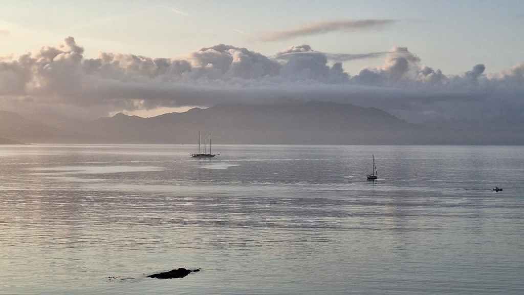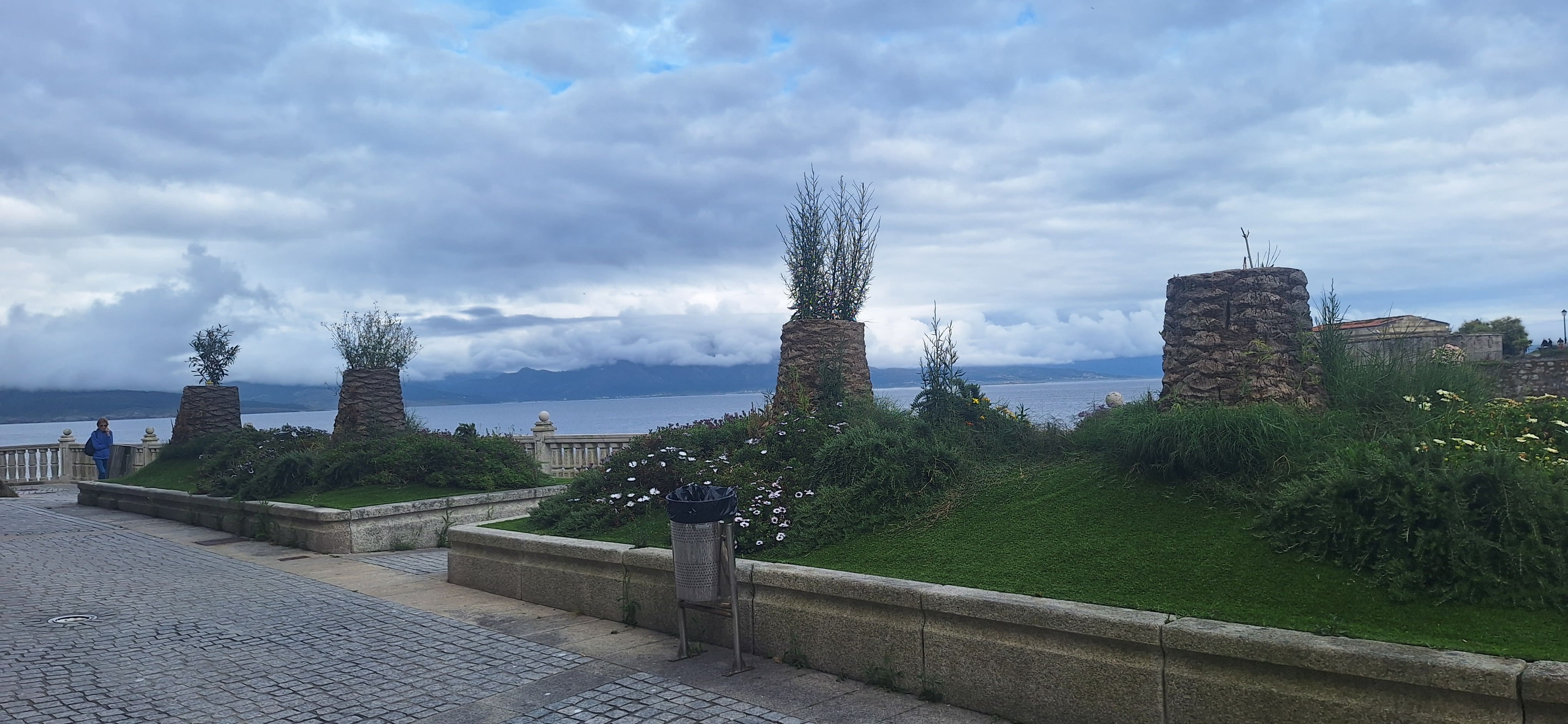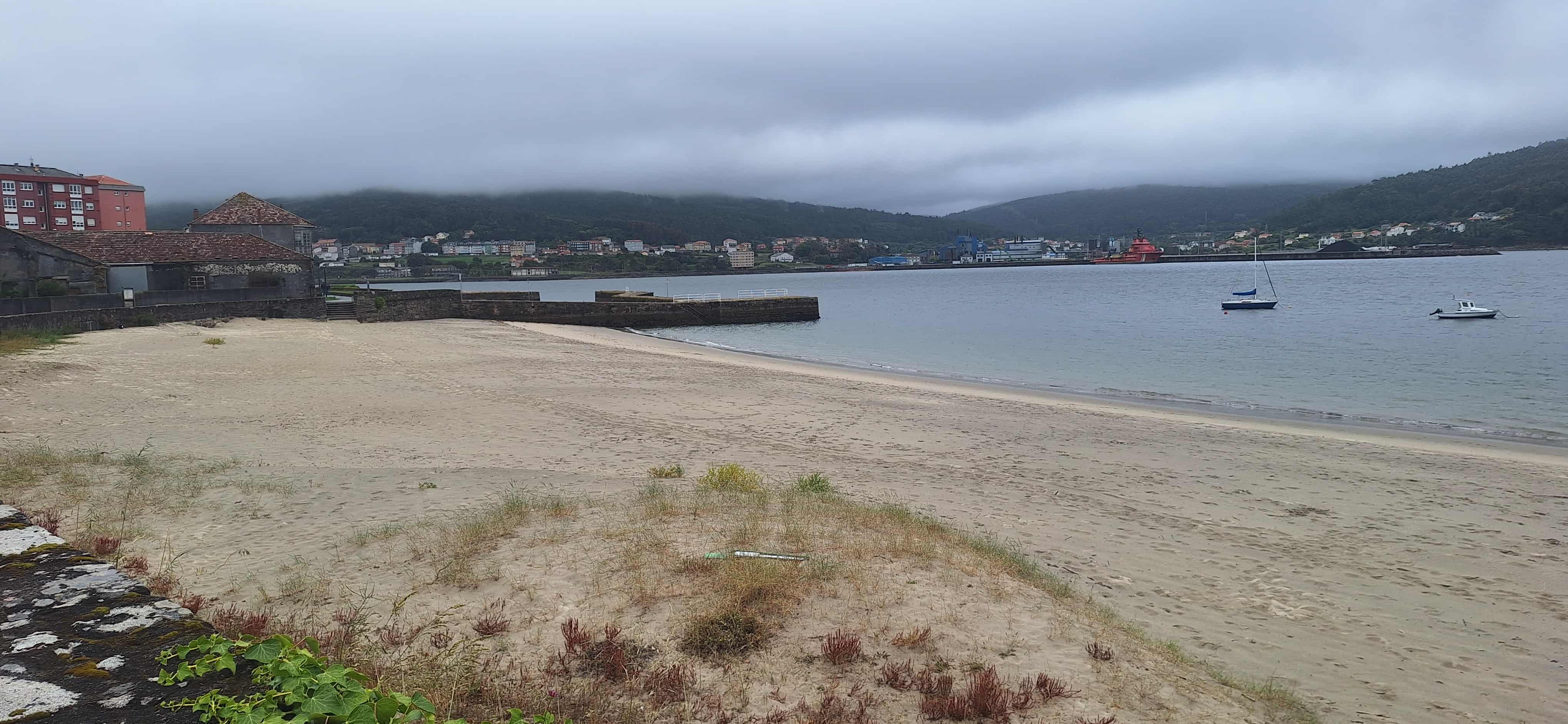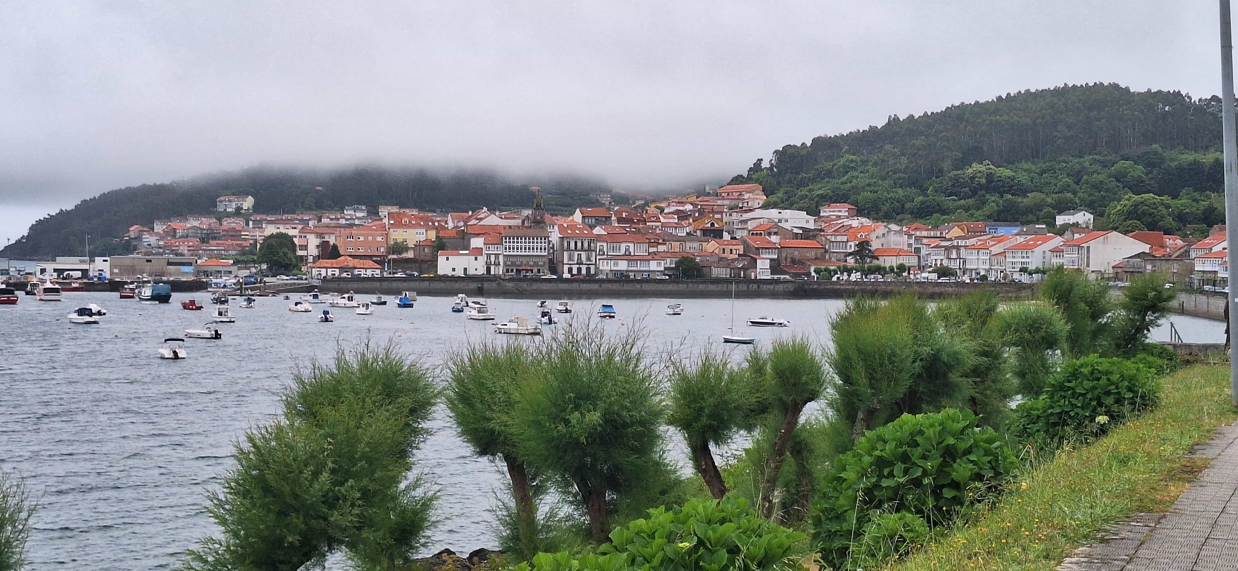 La tormenta de este día era impresionante y tan solo a media tarde nos dio un respiro al parar la incesante lluvia y despejarse algo la niebla que se había instalado en la bahía. El lugar es curioso, porque desde CEE, población importante en el centro de esta inmensa bahía, hasta Corcubión, hay tan solo 500 m. El alojamiento que me habían recomendado en esta localidad, era un complejo de apartamentos, con baño y habitación amplia con cocina y terraza frente al mar. La persona que lo regenta es muy amable. Pero estuve sola en todo el recinto. El tiempo no me impidió salir a comer por el lugar.